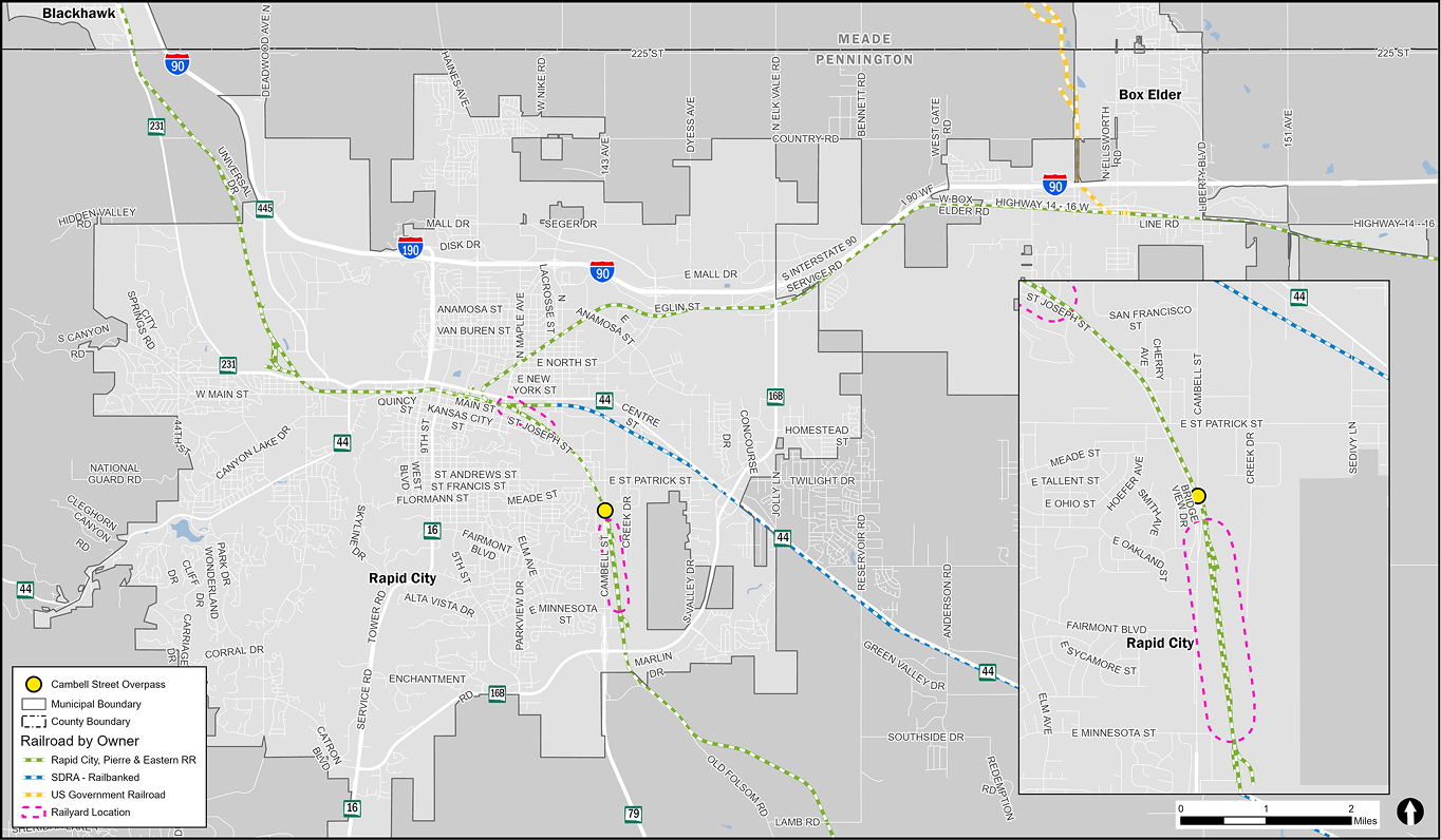 The Rapid City Area Metropolitan Planning Organization (RCAMPO) has initiated the Railyard Relocation Study to examine the feasibility of relocating the current Rapid City, Pierre, and Eastern Railroad (RCP&E) railyard to an alternate location, and thus, potentially reconfiguring transportation infrastructure and access in southeastern Rapid City. The Cambell Street Overpass is due for replacement or rehabilitation, and previous studies, driven by the age of the structure, have evaluated options for the future of the structure, including:
